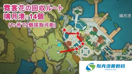 霓裳花推荐收集路线※下方介绍的是全部28个霓裳花的收集路线,培养1名角色需要168个霓裳花,可以分6次收集。望舒客栈(14个)从望舒客栈的传送锚点往下走,然后沿路一边往北走一边采集。客栈前的石板路两边有5株,穿过北边的桥之后还能看到2株,每株可采集2朵,共可采集14朵。1.望舒客栈前