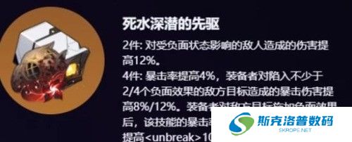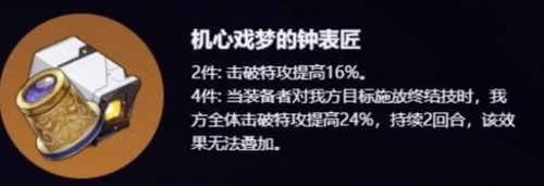 【死水深潜的先驱】2件效果:角色对有负面效果的敌人造成的伤害提高百分之12。4件效果:装备者的暴击率提高百分之4,并且对不少于2/4个负面效果的敌人造成伤害时,提高自身百分之8/12的爆伤,持续1回合。第一套是击破特攻套“机心戏梦的钟表匠”,两件套的效果是击破特攻提高16%,四件套效果是当装备者对我方目标施加终结技时,我方全体击破特攻提供24%,这个效果持续2个回合且无法叠加。毫无疑问,这是击破队辅助的新遗器,阮梅和艾丝妲专用。策划有意在2.0版本扶持击破队,后续还有配套的角色和光锥推出,目前版本并没有强力的击破C。
