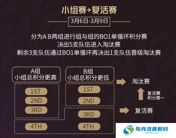 参赛队伍分为A、B两组,进行BO1单循环积分赛。
