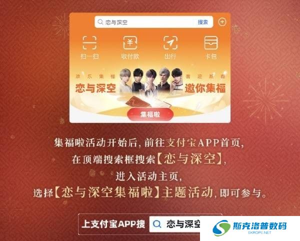 打开支付宝APP,在首页搜索框输入「恋与深空」或「恋与深空集福啦」,即可进入活动页面。