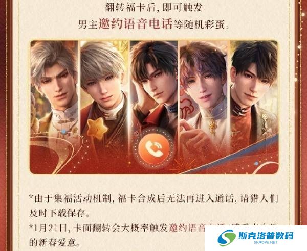 卡面彩蛋:1月21日,卡面翻转时可大概率触发男主邀约语音电话,感受满满的新春爱意。