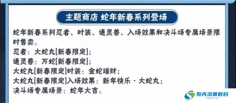 上架新春大蛇丸,以及新春大蛇丸的时装和他的入场效果,还会上架一个通灵兽新春万蛇,和专属的决斗场场景【蛇年大吉】。