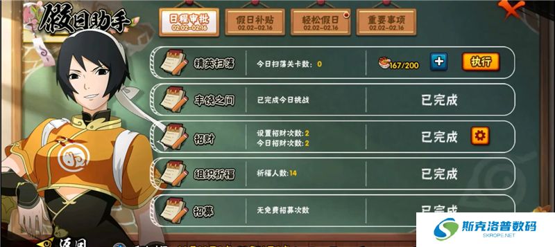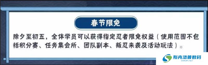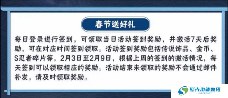 春节送好礼,每日签到即可获得奖励。春节限免,除夕到初五,玩游戏每天都可以体验到不同的忍者。