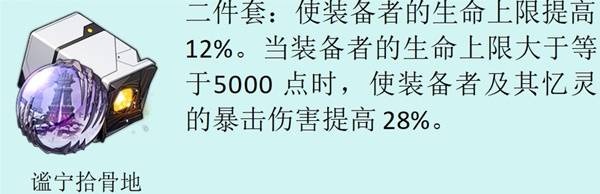 4件套:当生命上限≥5000时,装备者及其忆灵的暴击伤害提升28%。