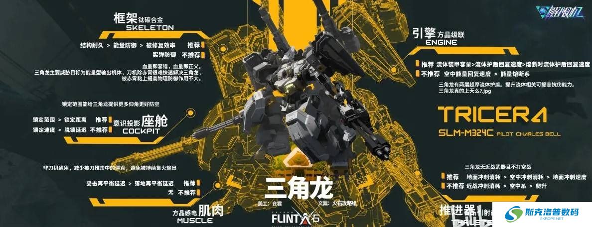 由于三角龙有两层超厚的流体装甲,配件选择应围绕流体装甲进行搭配,以最大化其防御能力。