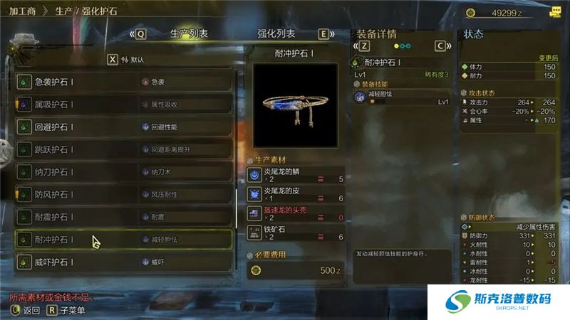 护石:只能装备1个,有着很不错的装备技能,制作材料是少量采集素材,其余大部分都是怪物掉落的,跟其他装备素材一起刷就行。