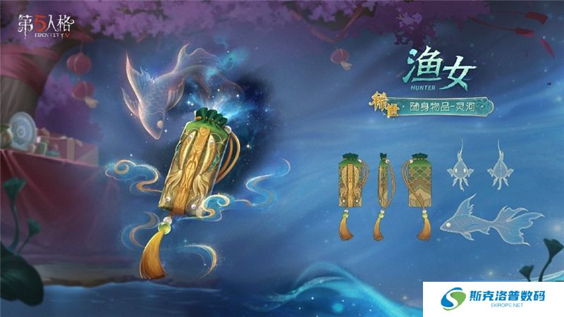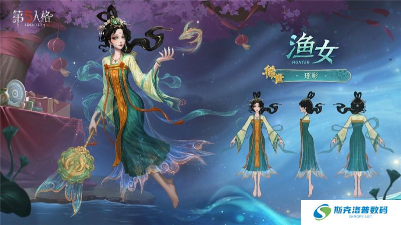 飞天髻半梳于发顶,披散的发尾漆黑如墨,漫卷如云;微敛的眉眼柔和似水,如同仙子落入凡尘,纵使珍珠玉石环绕,也不比她的神色明媚。身着霓裳羽衣,背悬三彩鱼瓶,层层轻纱随她清歌曼舞,似一尾游鱼在银河间腾跃。手中的蒲扇工艺精致,一对衔尾的金鲤雕刻其上,轻摇时如同鱼儿扇动尾鳍,送来阵阵清凉的晚风。