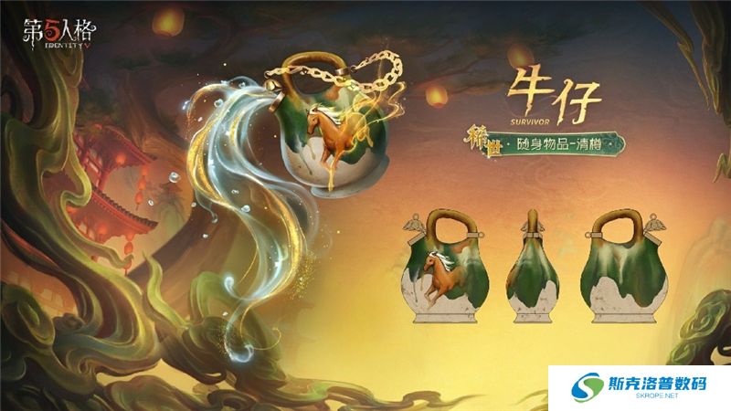 造型是一只蓝色的瓷瓶,瓶身上有着银白色的云纹和立体的蓝色渐变祥云,云间飞舞着金色的鹊鸟,瓶中是翠绿的柳枝,正在随风摇曳。