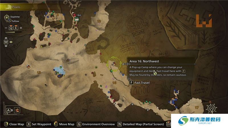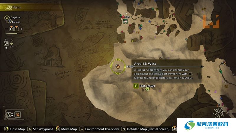 该营地位于绿洲以西的沙漠地带,虽然地势开阔,因此缺乏安全保障,但它并不在怪物的主巡逻路线之上,相对较为隐蔽。如果你不喜欢地下水脉营地,那么这里会是区域 13 的次佳选择。