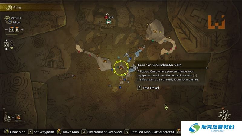 这个营地位于区域 13 下方,可以通过区域 13 的绿洲营地附近的洞穴进入,或者直接从区域 14 或 15 进入,找到通往地下水域的小径即可。这个营地提供了通往区域 13、15 和 16 的安全路径,特别适合需要往返远离主营地的猎人们。