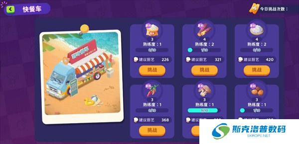 >>餐车同一个调料刷多了熟练度升级,一次能获得4个原料。搭配外卖使用,餐车只刷几个原料的熟练度,获取后去加工,其他的调料则从外卖带回来的礼包里选择,性价比高一点。