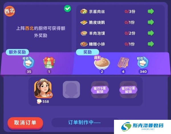 外卖订单很重要,里面有个额外奖励,派遣符合的厨师能带回来一个调料礼包。如果外卖订单和你的厨师不符,可以拒绝订单,5分钟后会刷新,相当于一天能有48个调料