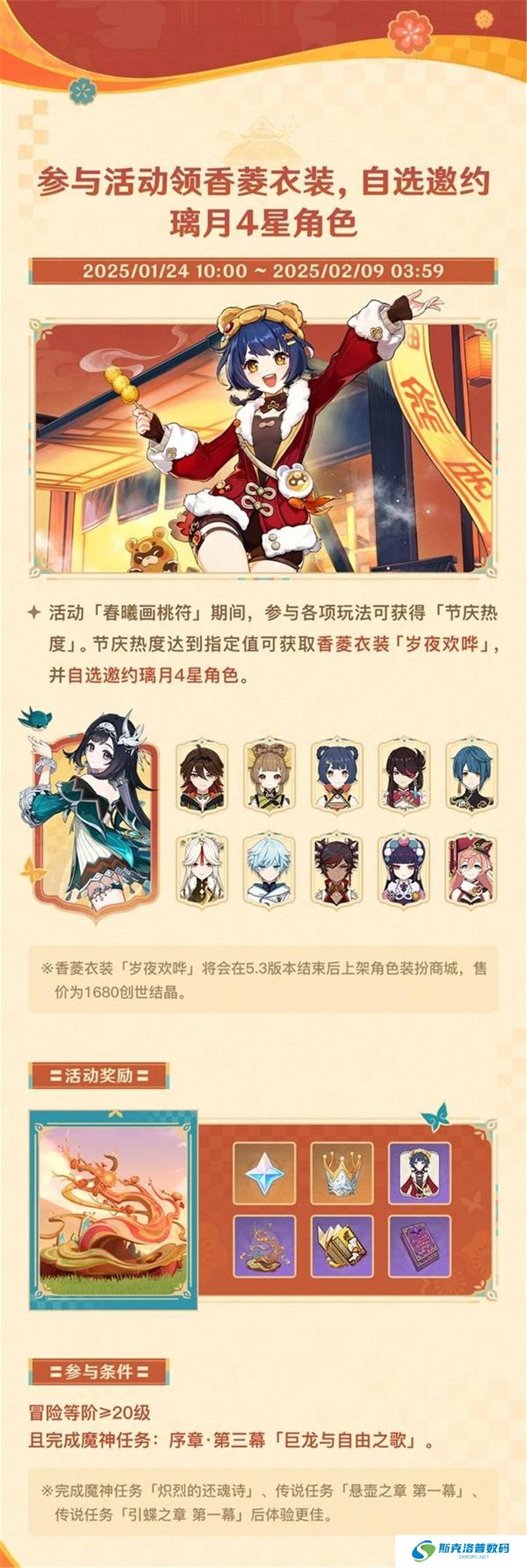 玩家还可以通过活动获取香菱的新皮肤“岁夜欢哗”,该皮肤在5.3版本结束后将在角色装扮商城上架,售价为1680创世结晶。