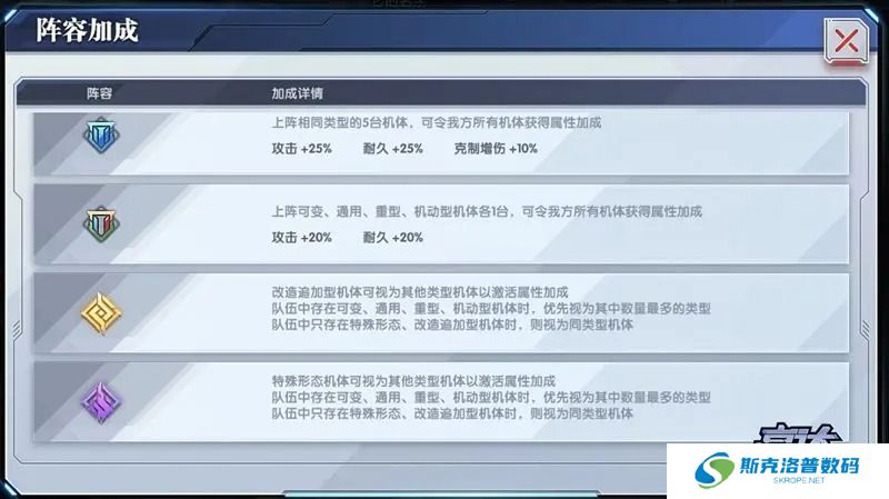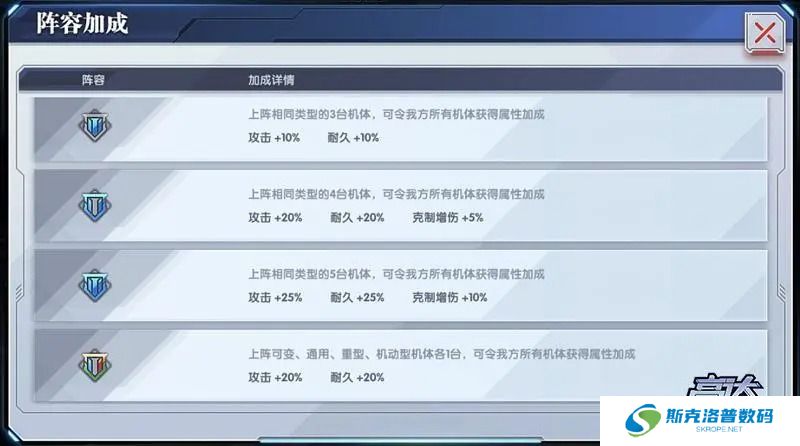 除了克制关系外,机体类型还会影响我们在编队时获得的阵容加成。上阵3台、4台、5台同类型机体时,所有机体将分别获得攻击和耐久的加成;上阵4台及以上同类型机体时,还可以获得额外的5%和10%克制增伤。