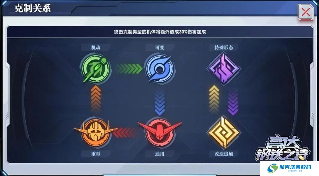 游戏中的6种机体类型存在互相克制的关系:机动克制可变,可变克制通用,通用克制重型,重型克制机动。例如,机动类机体攻击可变类机体时,将获得30%的伤害加成。“特殊形态”与“改造追加”类型的机体互相克制,攻击对方时均可获得30%的伤害加成。