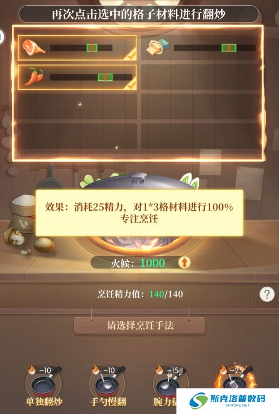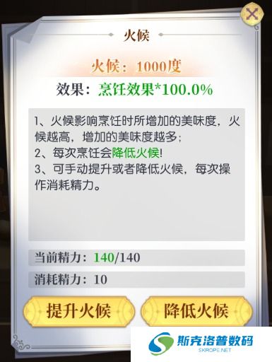 每次烹饪都会消耗精力,调整火候也会消耗精力。因此,需要在精力耗尽前完成烹饪,否则无法继续提升美味度或更改火候。