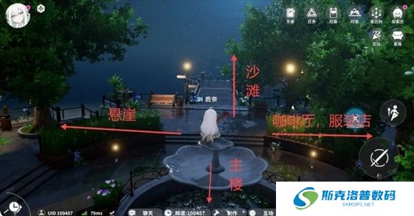 首先我们往主楼方向走,可以看到一条连接悬崖的小道,在主城和饰品店之间会有一处石块点位