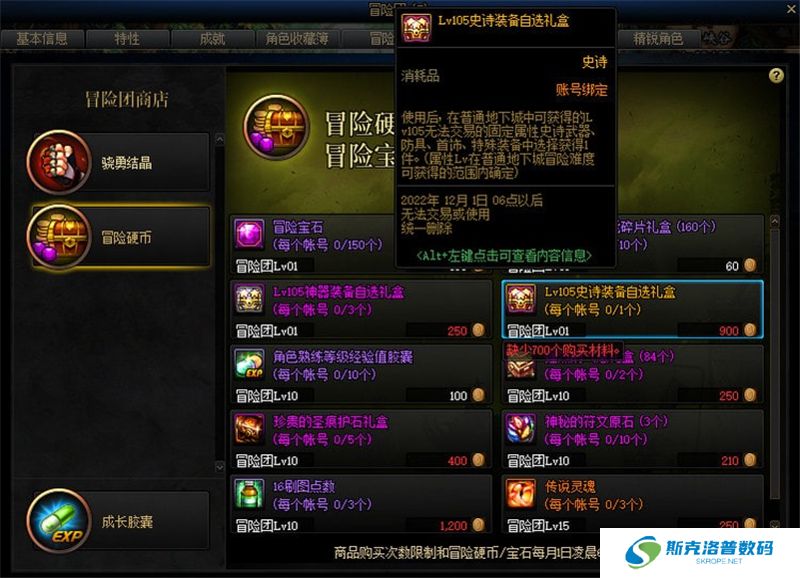 使用冒险硬币可在冒险团商店中兑换105级史诗装备自选盒。