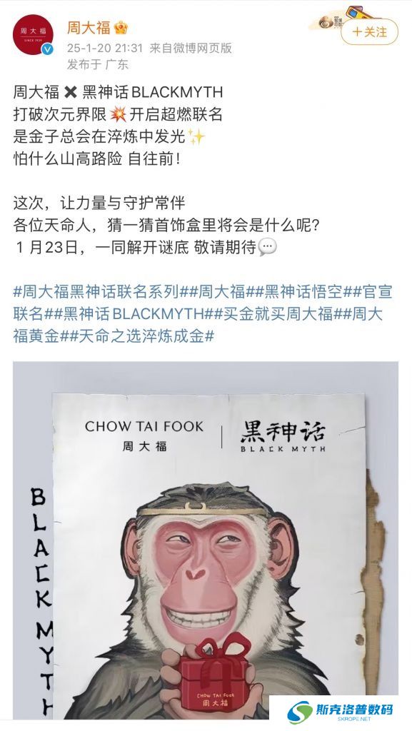 周大福与国产3A游戏黑神话悟空进行了联动,并将在1月23日公布更多联动细节信息。