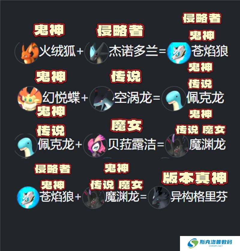 佩克龙【鬼神、传说】+贝菈露洁【魔女】=魔渊龙【鬼神、传说、魔女】