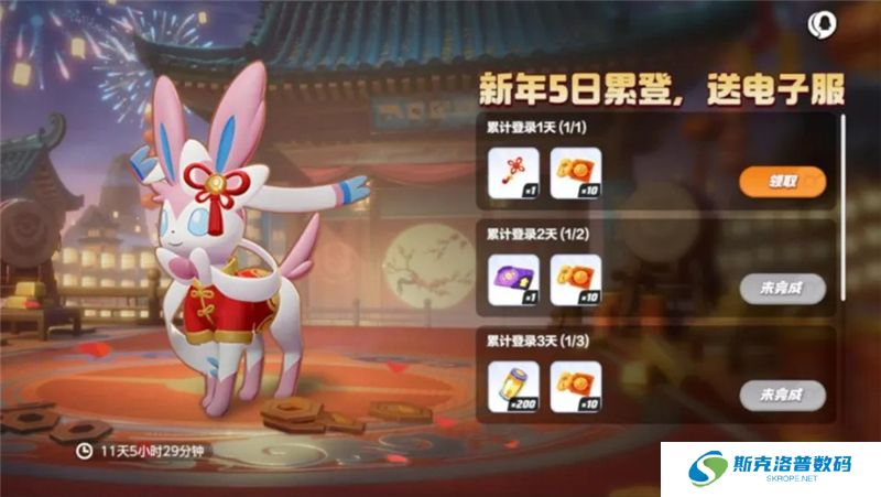 新年有礼,见面即欣喜!1月28日起,训练家每日登录游戏均可领登录礼,累计登录5日可免费获得新春风格仙子伊布电子服,登录首日即可获得贴纸(新春挂饰)哦~