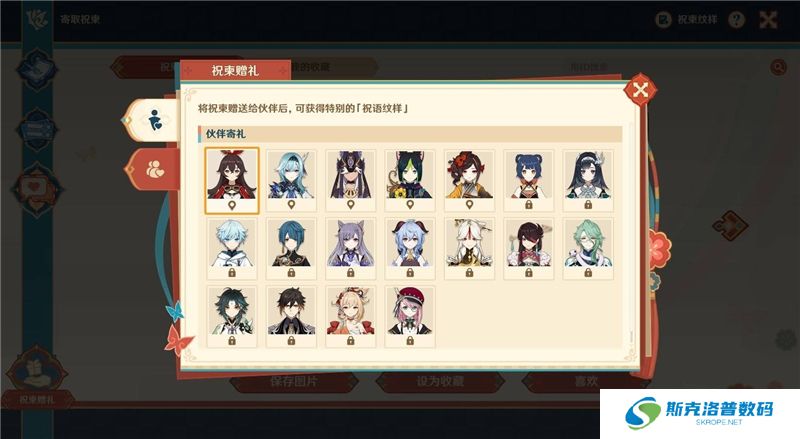 除此之外,在活动界面点击【寄取祝柬】,然后点击左下角【祝柬赠礼】,可以找到在璃月港参加海灯节的各位伙伴,与伙伴对话可以解锁特殊的【祝语纹样】。