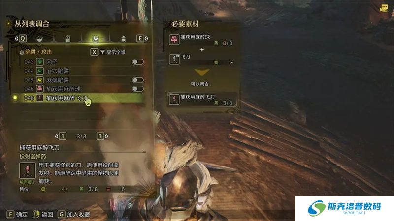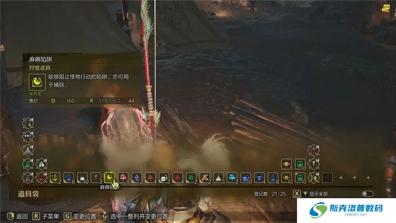分类使用:除了捕获网和陷阱,其他道具都需要怪物先踩中陷阱(可以不用捕获类陷阱)后再用才行。这边地图小怪和虫子都是使用捕获网,boss则需要捕获陷阱或者更进一步的各种道具(麻醉球那些)。