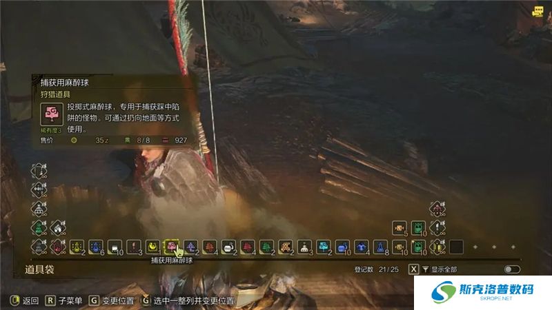 捕获道具:捕获道具中除了捕获网,其余均为消耗品,用一次就没,特别是陷阱,一个道具袋一个陷阱还只能带一个,所以使用时机非常关键,没用好就直接错过了。捕获道具有捕获网,标明了可用于捕获的陷阱;以及捕获用麻醉球,麻醉飞刀,麻醉弹。都是说明里标注了捕获用的才行,这些道具均可猎人们自己调和制作。