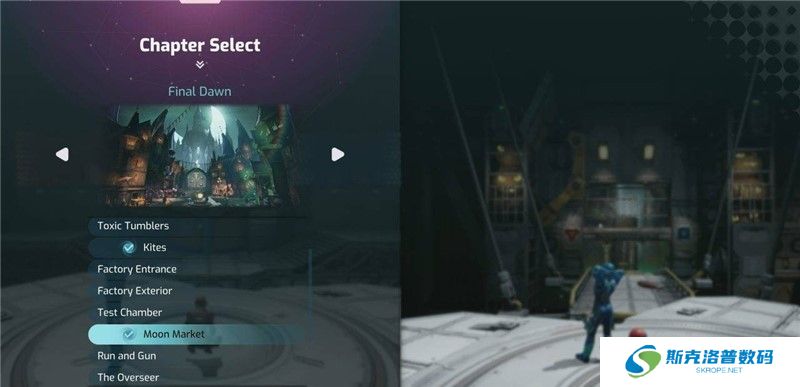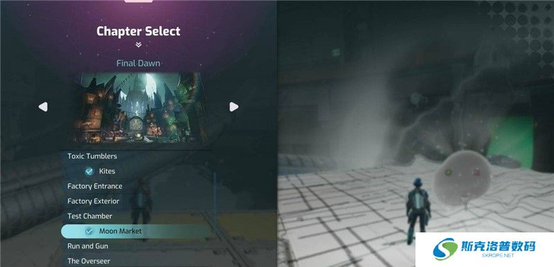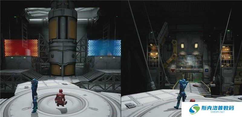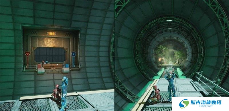 操作玩家一和玩家二分别穿过红色和蓝色的门,前方需要穿过走廊,在走到走廊一半的途中,到达一个平台,平台上有4个移动小平台,主线需要继续往前走,先不要推进主线,走左侧小路到尽头即可看到这个支线任务气泡。在此支线任务期间可以解锁奖杯/成就【药剂大师】和【负重前行】。