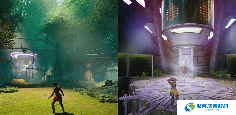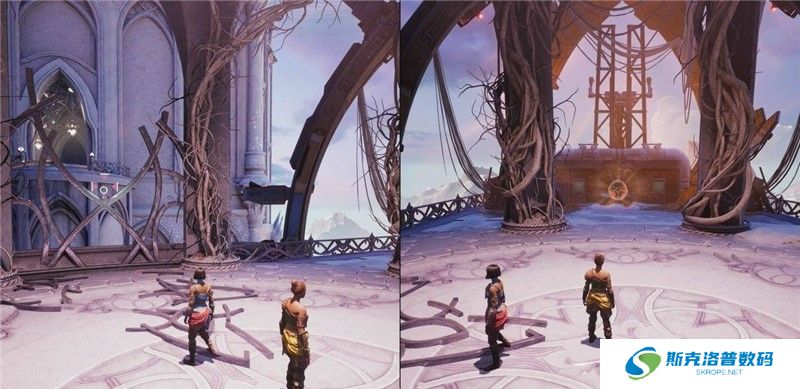 《双影奇境》的核心玩法是双人合作冒险,玩家需要通过默契配合解开谜题、战胜敌人,游戏在科幻与奇幻世界之间切换,每个关卡都有独特的机制和能力。