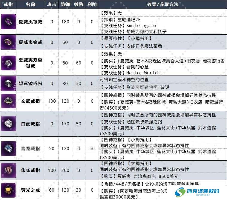 四神戒指套装(青龙、白虎、朱雀、玄武)不仅单个戒指有属性,集齐四个还可以获得额外的异常状态抗性。