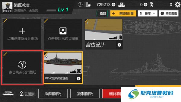1. 对于新手玩家,还可以选择购买其他提督的图纸或获取建造授权。点击“购买设计图纸”按钮进入图纸交易大厅,浏览并购买其他提督的设计。您还可以查看这些设计图纸并进行模仿或改进。