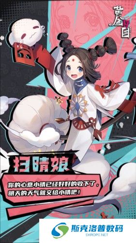 扫晴娘化形为一位悬挂在屋檐下的红色剪纸人,通过收集人类的心意来改变天气。随着时间的推移,人类不再畏惧天气,扫晴**妖力也因此逐渐削弱。