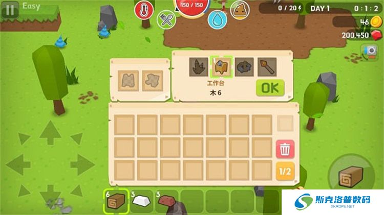 在工作台中,你可以制造帐篷、厕所、水桶等生活用品。最重要的是制作武器,如木剑,这样就能应对夜晚的怪物袭击。通过制作木斧和木镐,你可以更高效地砍树和挖矿。
